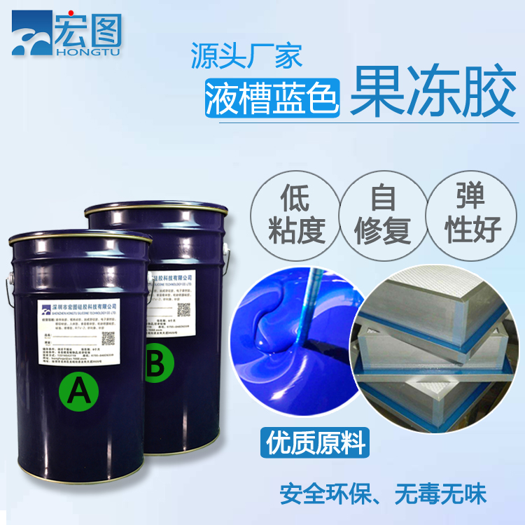 液槽膠也叫果凍膠、液槽果凍膠,是一種AB雙組份液體硅膠,A組分為透明液體,B組分為藍色(顏色是可以根據客戶需要進行調整的),安全環保,高韌性,固化后密封效果優異。
